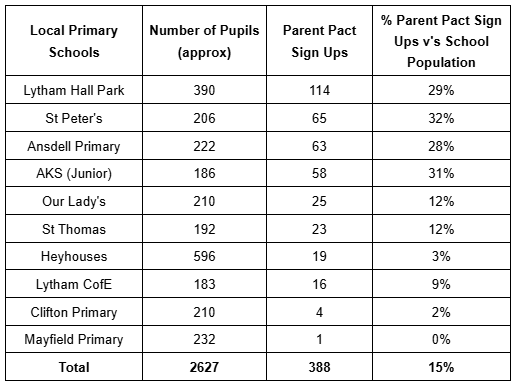 We have been genuinely overwhelmed by the level of support from local schools, particularly those who have displayed the SFC School Gates banners. Thank you to you and your parent school organisers for arranging this so promptly, the visible show of unity across our schools is powerful. The Parent Pact is our online pledge encouraging parents to delay getting smartphones until 14 and social media until 16, which continues to gain momentum. Nationally we have 180,754 signed pacts! The Lancashire leaderboard currently stands at 2,089 signed Parent Pacts, with strong representation from our local school communities. In fact, the figures below account for nearly 20% of the region-wide total, demonstrating significant local support for a delayed approach.