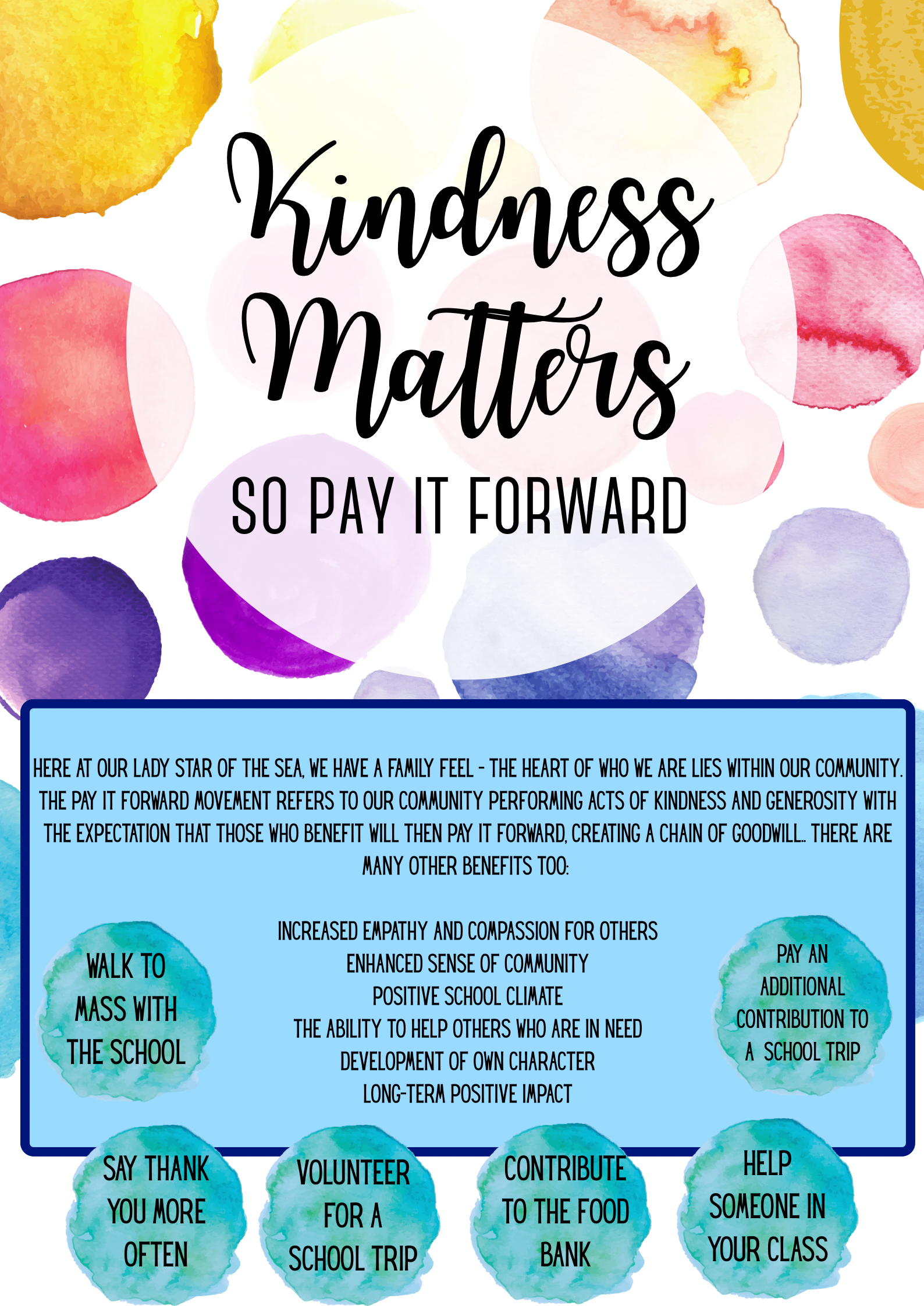Kindness and acts of kindess are central to life here at Our Ladys. Without the support of each other, none of us would be able to thrive and our growth would be stunted. The need to help others is as important now as it ever has been before, in all manner of ways, so this year we will be looking at ways that we can pay kindness forward to every single member of our community. This campaign links into us being sustainable as a community. There are lots of ways that you can pay kindness forward, and I can’t wait to hear about them throughout the year. Another way to help us to be financially sustainable is for you to pay a school trip forward for another child. In recent years, the cost of transport has increased, and whilst we still want to provide enriching experiences for our children, we understand that the cost can be unmanageable. There will be an option on Parent Pay to Pay It Forward. It could be the entire cost of a trip or just a donation if and when you can afford to do so. We have an incredibly generous community, in every sense of the word so I know that this will be a welcome addition. It is hoped that the small amount of money we raise from this will support lots of children and families across the school and provide that inclusive environment that our budget is struggling to maintain. Again, thank you so much for your support.