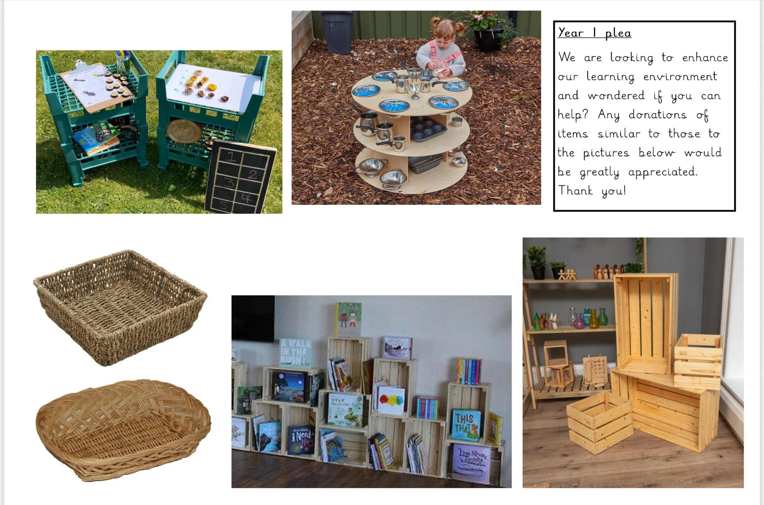 Our Year 1 classroom is having a makeover during the summer holidays with a new roof and a bit of paint inside. Miss Bassett and Mrs Hartley are eager to get in there and make it look really exciting. They are after a few things to make it homely for the children. Over the summer if you have any of these things, please can you put them to one side? Crates, cable reels and baskets please.
