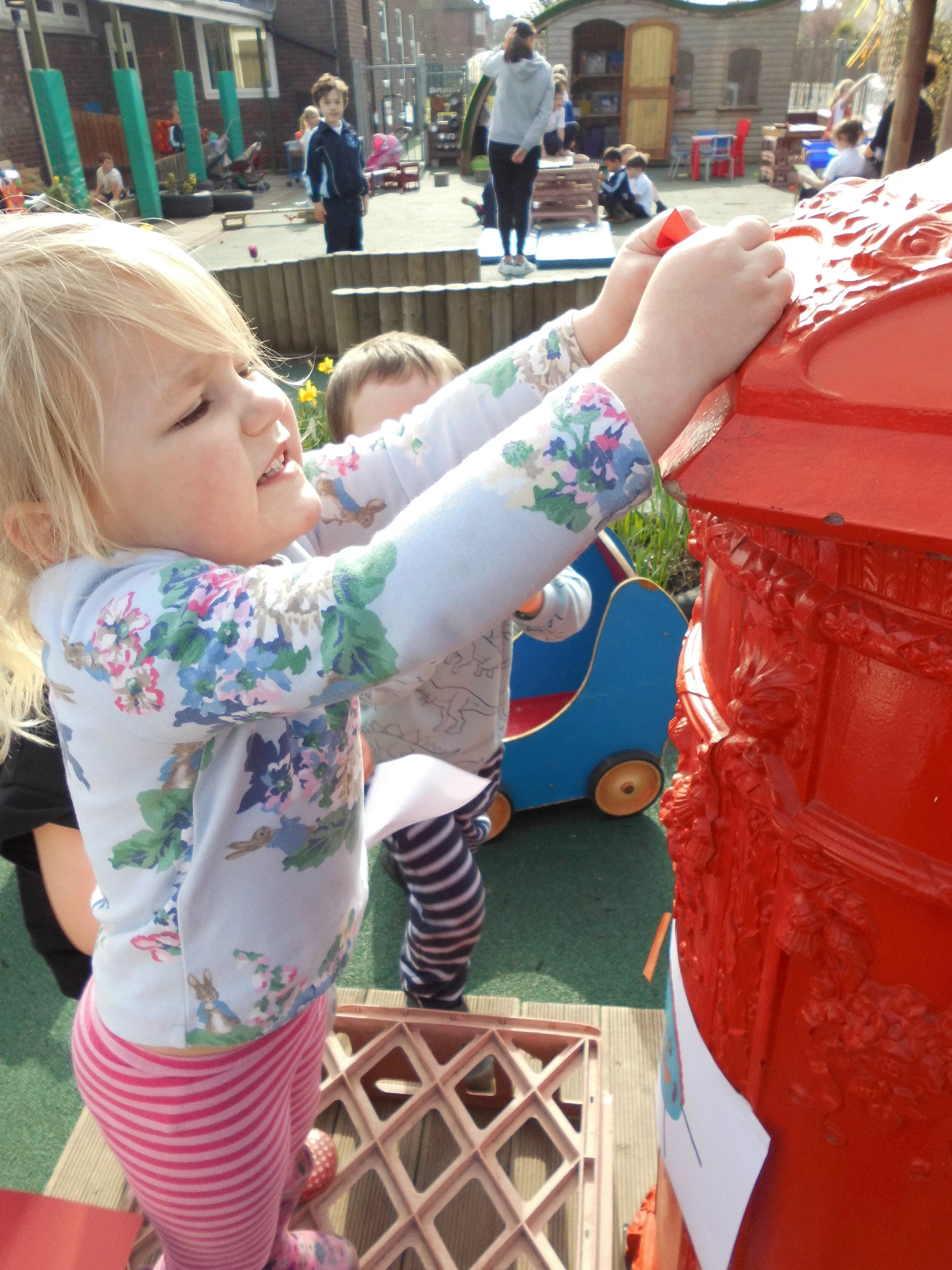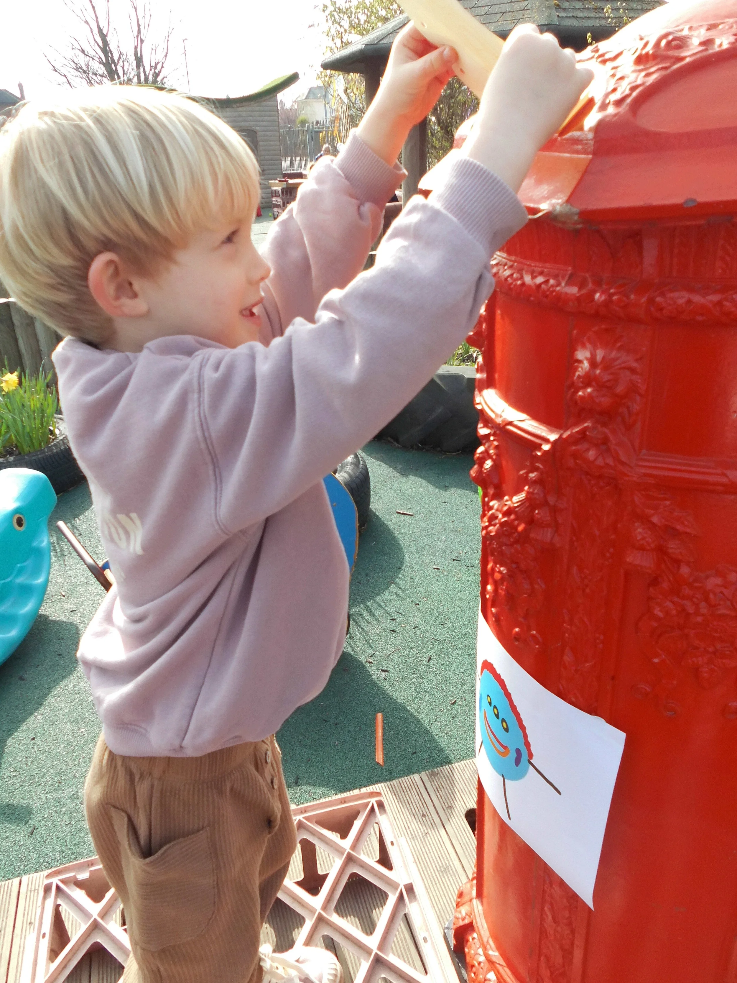 Whilst we were in the garden the children wrote letters to the Poggle monster. We drew a picture of the Poggle on the computer and then stuck it on to the post box. You can write anything to the Poggle even if you are missing mummy and daddy. If you want to summon the Poggle you stamp your foot three times….
