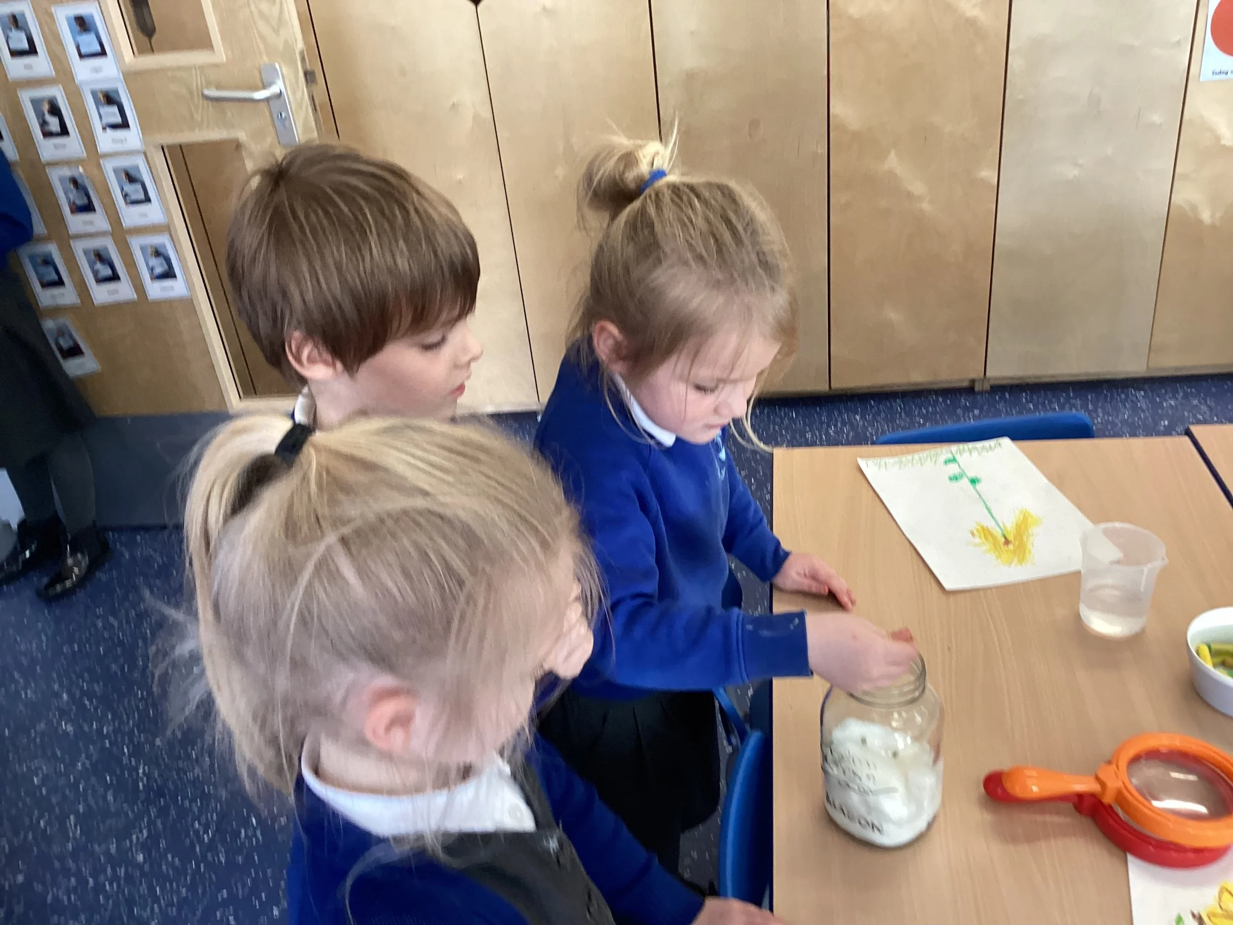 Science: we have loved our science this week, we went on a signs of spring hunt and did a tree bark rubbing, drew flowers outside and in our books and labelled them. Then we planted cress seeds and pea shoots and used magnifying glasses to help us draw an observational picture of a daffodil with oil pastels. One of our apple seeds germinated. We know it takes years for a tree to grow but we want to investigate and see what will happen to our seed while we are in Year 1.