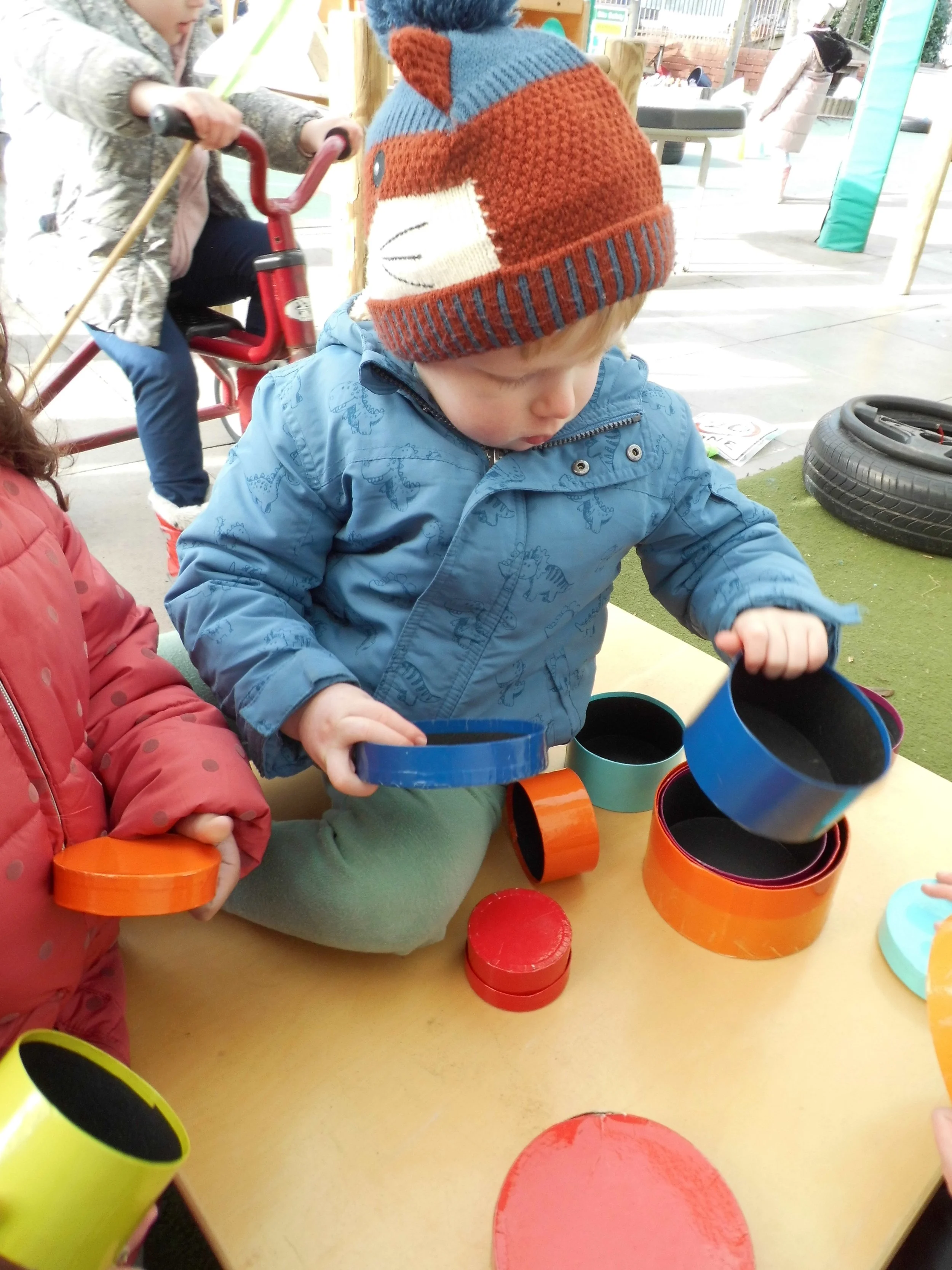 We also had challenges this week to make number lines with the pebbles. What number came next? What number is missing from the line? Hmm, we had to think and work out the problem, concentrating like Cooper Crab! Another challenge was to fit lots of stacking boxes back inside one big box. This was really tricky and got us all using our brains.