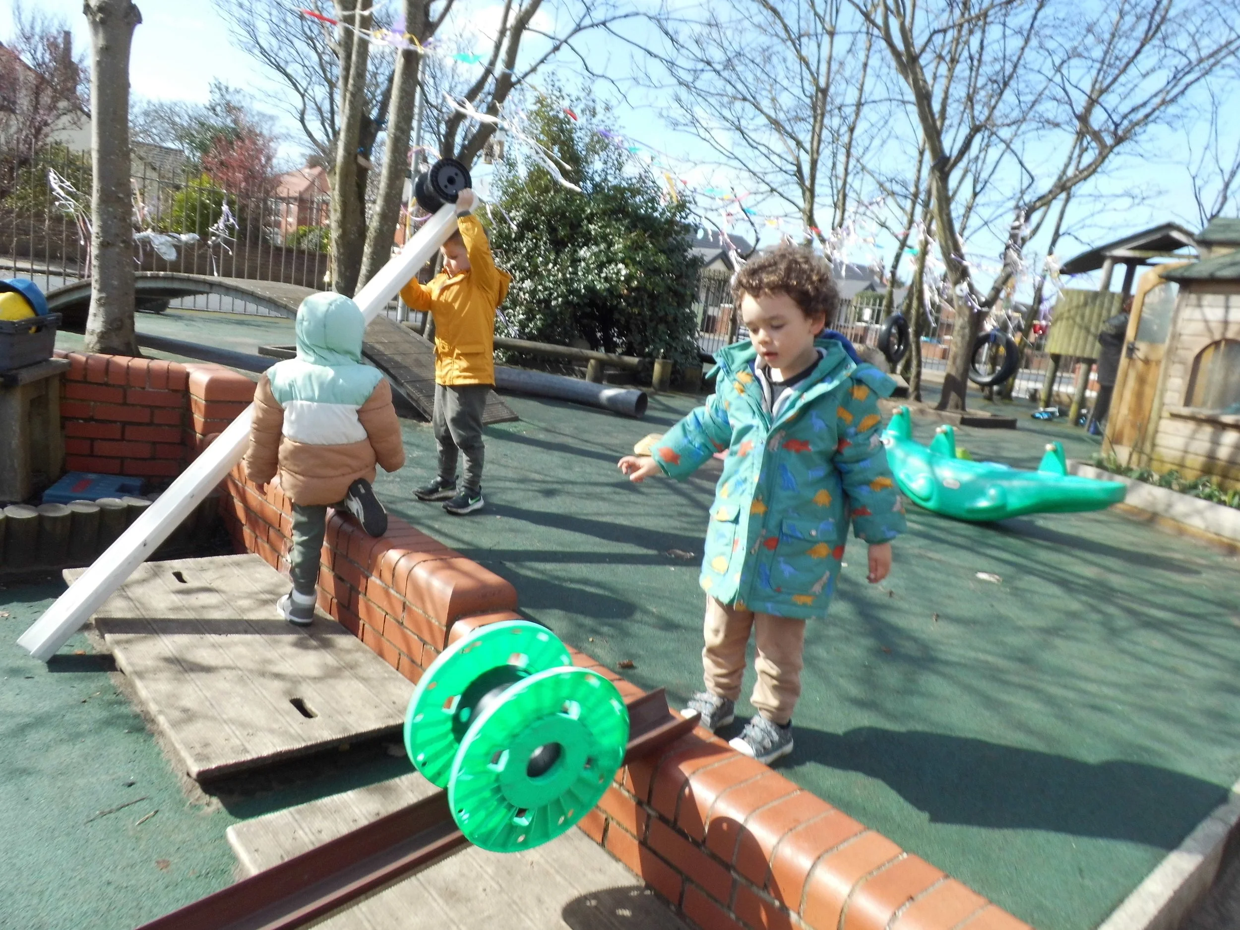 We had lots of messy fun as we painted and made tracks using lots of different sorts of vehicles. We have also had races using reels and balls down the drain pipes.