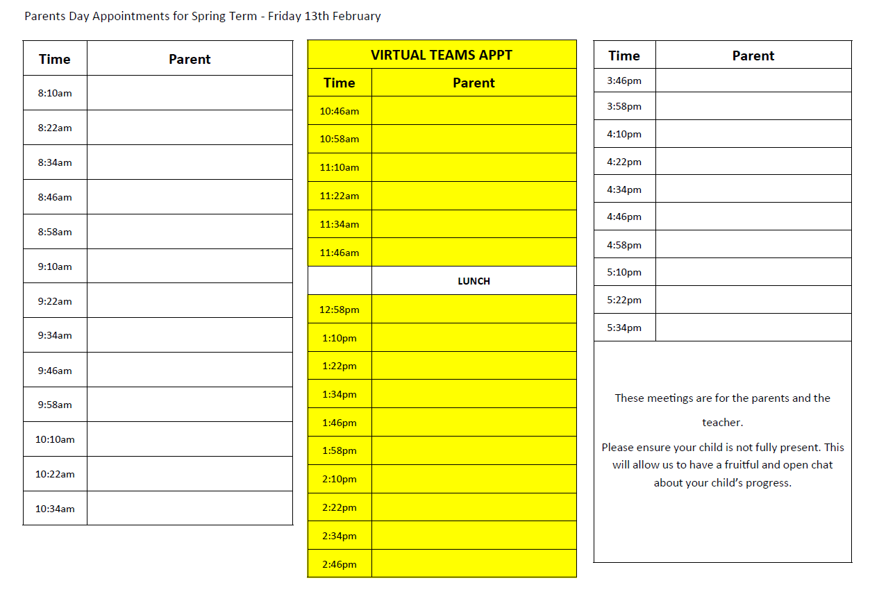 February Friday 13th - Please email me or come after school to let me know your prefered time for parents day. I have displayed an image of the times I am available on the day. Please note the yellow is for virtual and the white face to face. Please email with your prefered time and I’ll email back on a first come system.