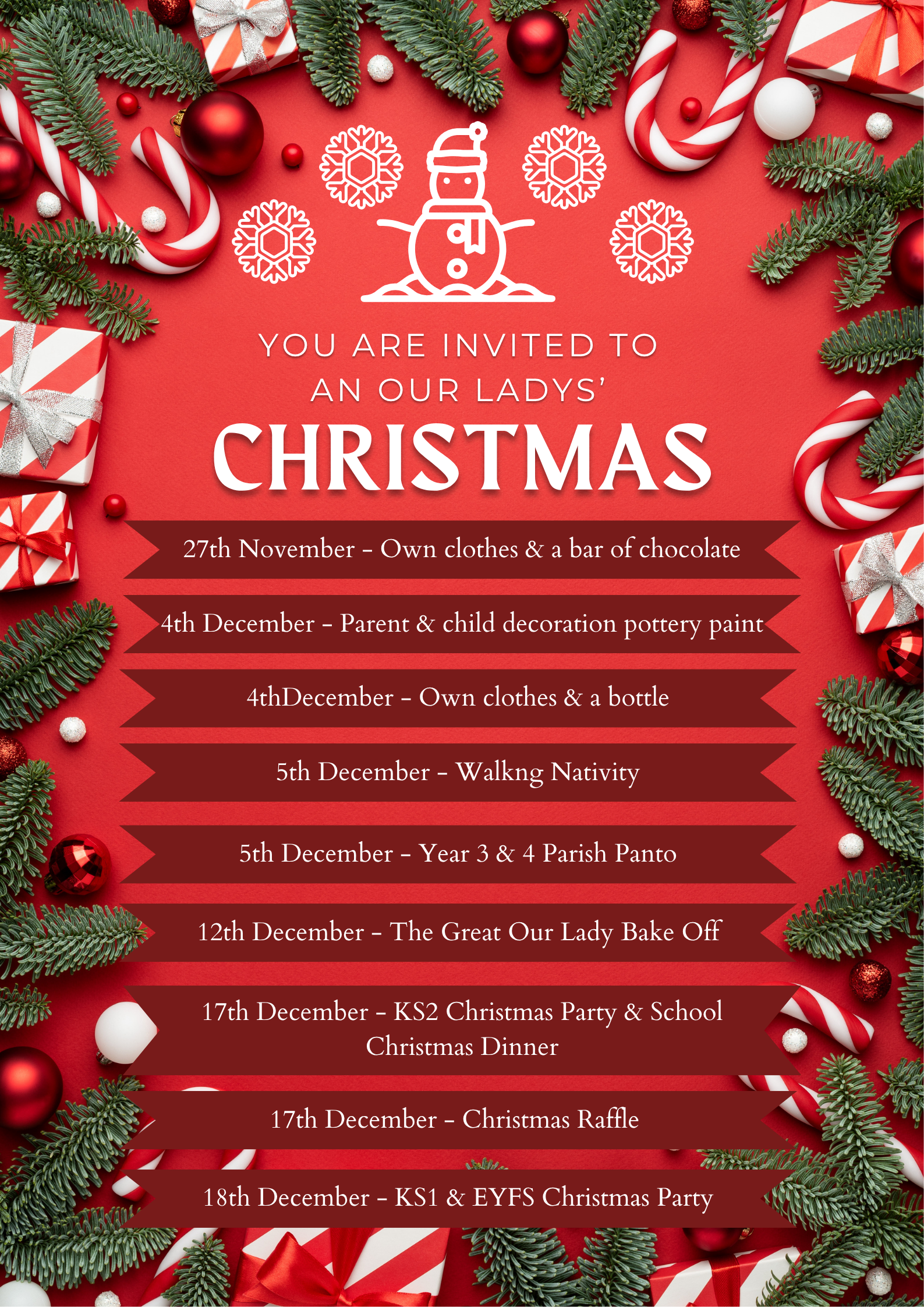 This is also a period of fun and enjoyment and we are very good at that too. Next Thursday, the children are invited to come into school in their own clothes, but they must bring some chocolate with them that can be added to our raffle hampers. The following week it will be a bottle - any bottle (ketchup, bubble bath, alcohol) the choice is yours. All of these goodies will be collated for the hampers which can be won in the raffle. Thank you so much for the prizes we have received already; Stringers Voucher, Avanti Train Voucher, Beaverbrooks Necklace, Christmas tree and skirt, hair vouchers - please keep them coming in.