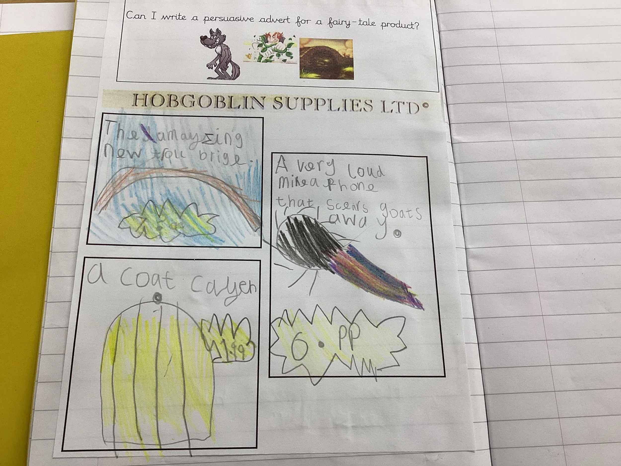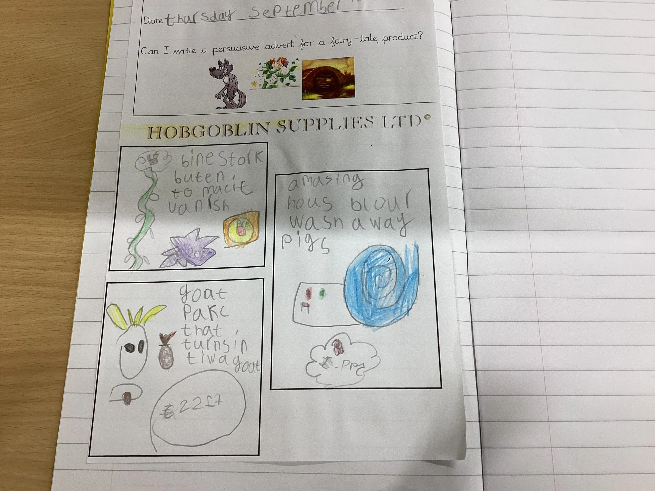 Unfortunately not all the permission forms are back, therefore I’m unable to post pictures with children this week. We have been super busy! I really want to celebrate the writing in class. I’m so impressed with everyone - we have been really creative. You may have seen the Hobgoblin Catalogue that came home- well on Thursday we created new adverts for new products. We had to think of things we could sell to “Baddies” - giants, ogres and big bad wolves. We came up with:
