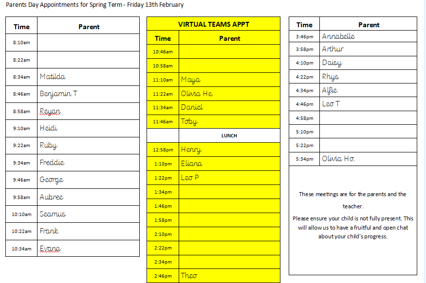 Read moreYear 3 Parents Day Appointments Friday 13th February